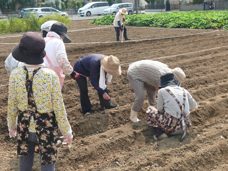![]() ジャガイモは間隔をあけ中間に置肥をし植え付ける |